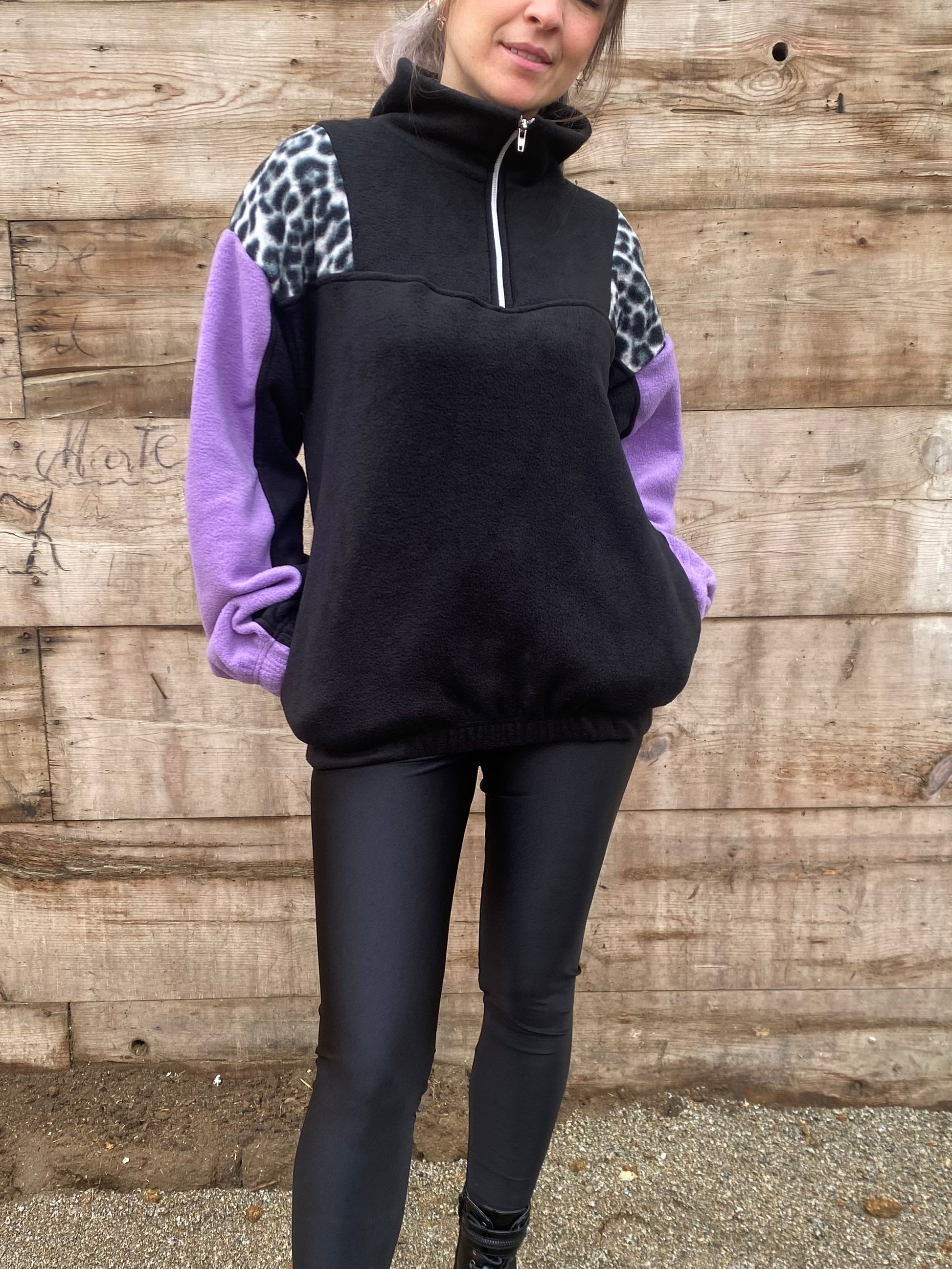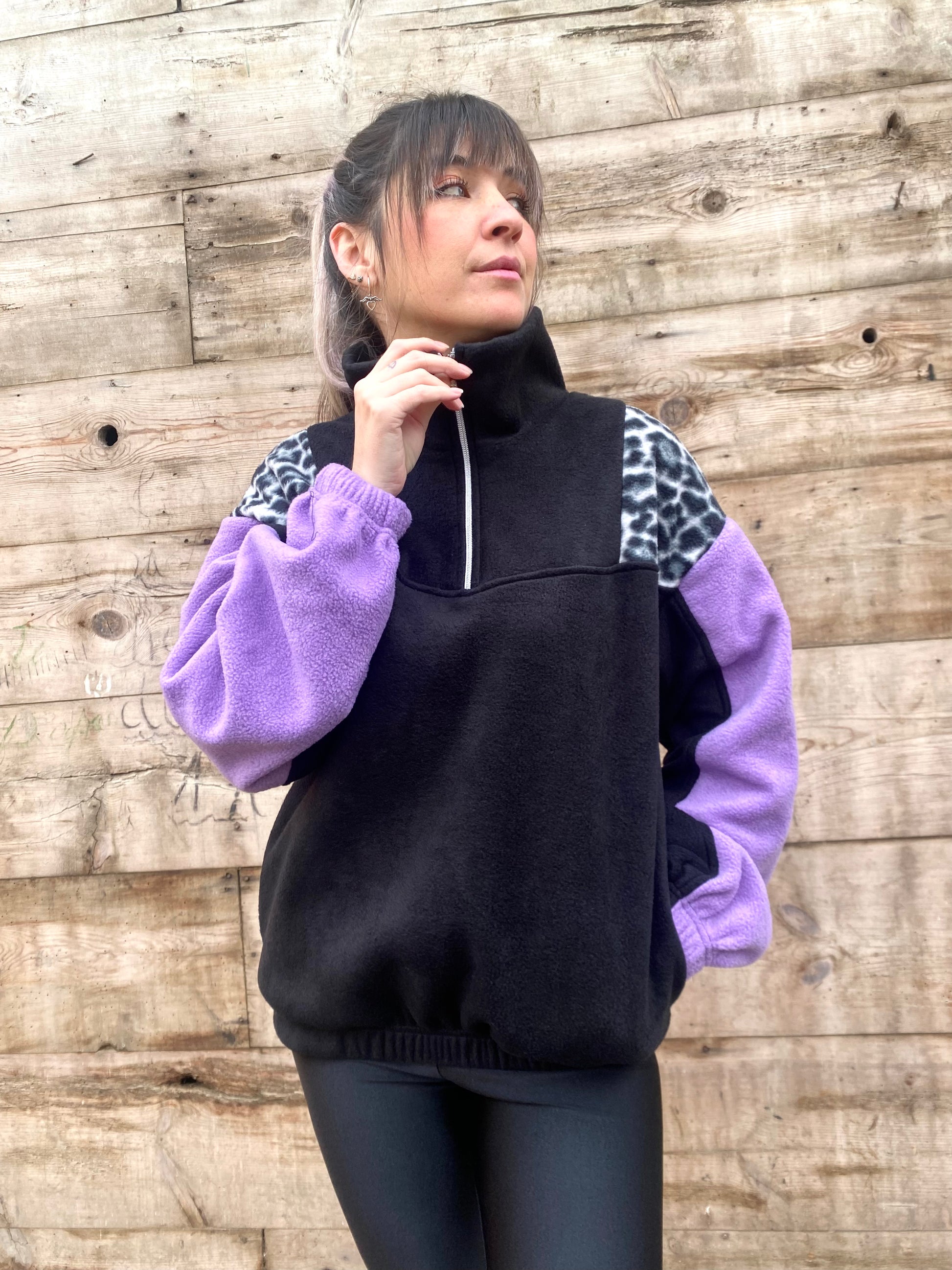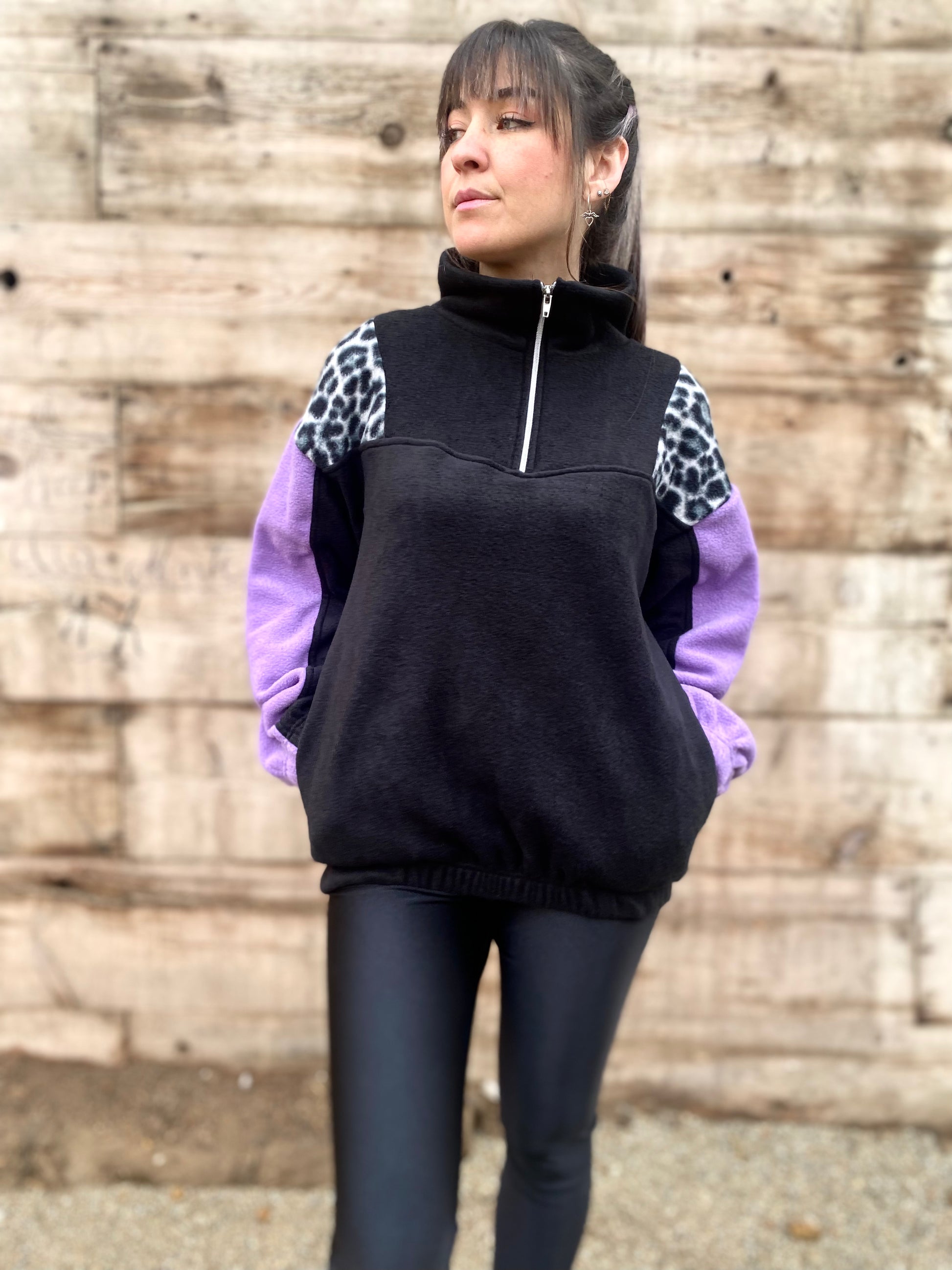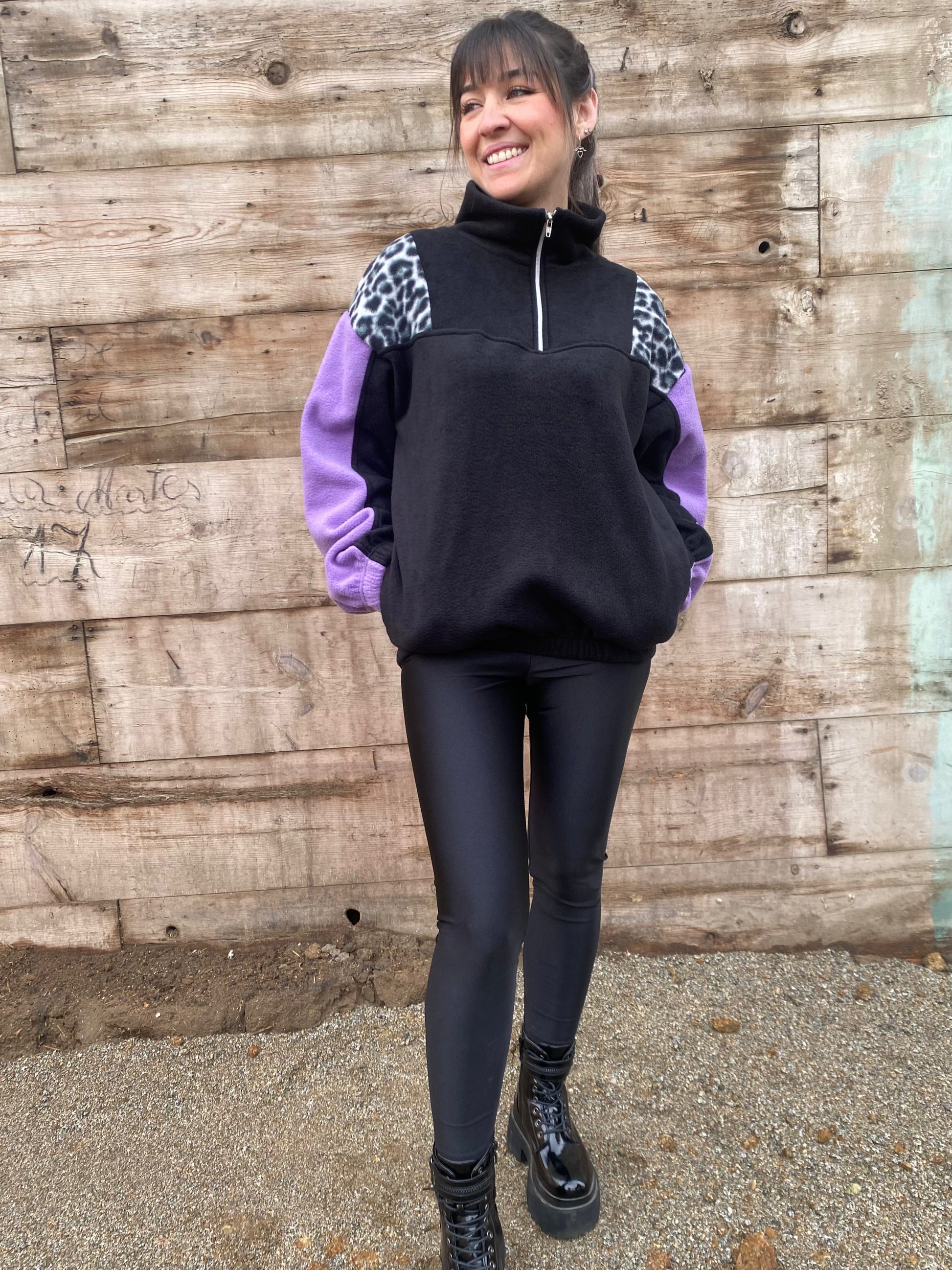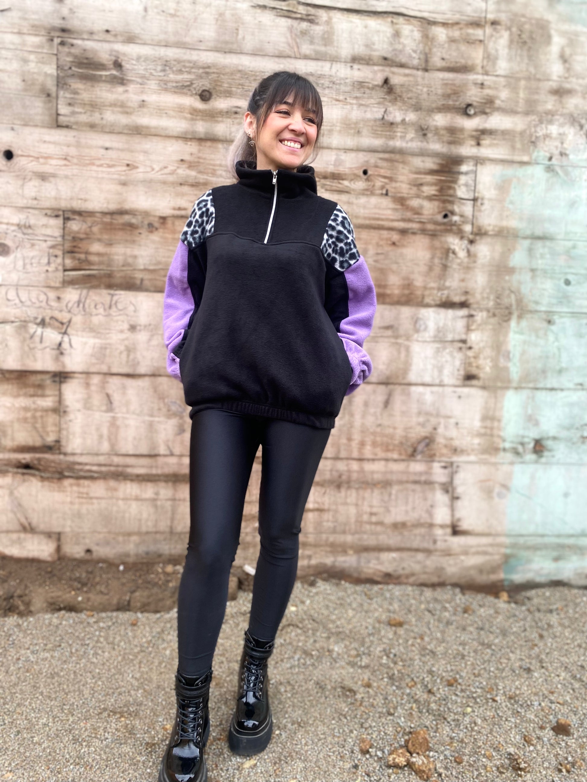 Modelo fabricado en polar con medio cierre bolsillos elástico en la pretina, combinación de colores negro, lila y aplicación leopardo gris
