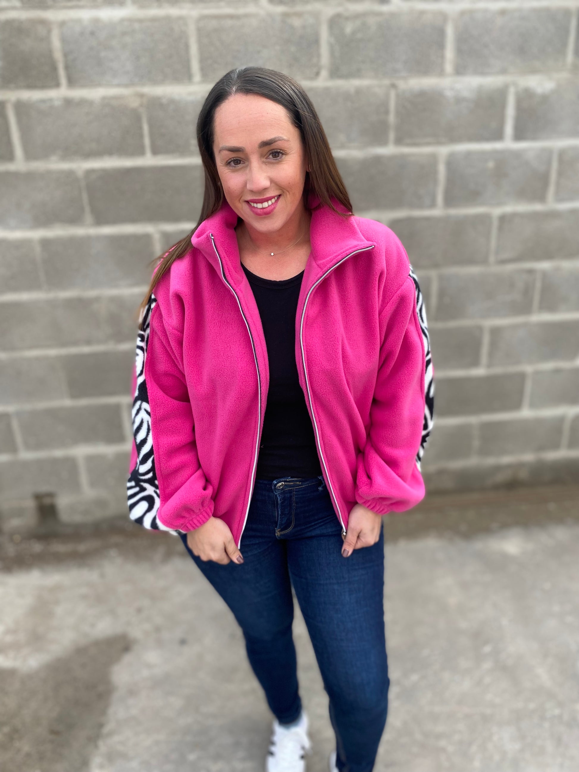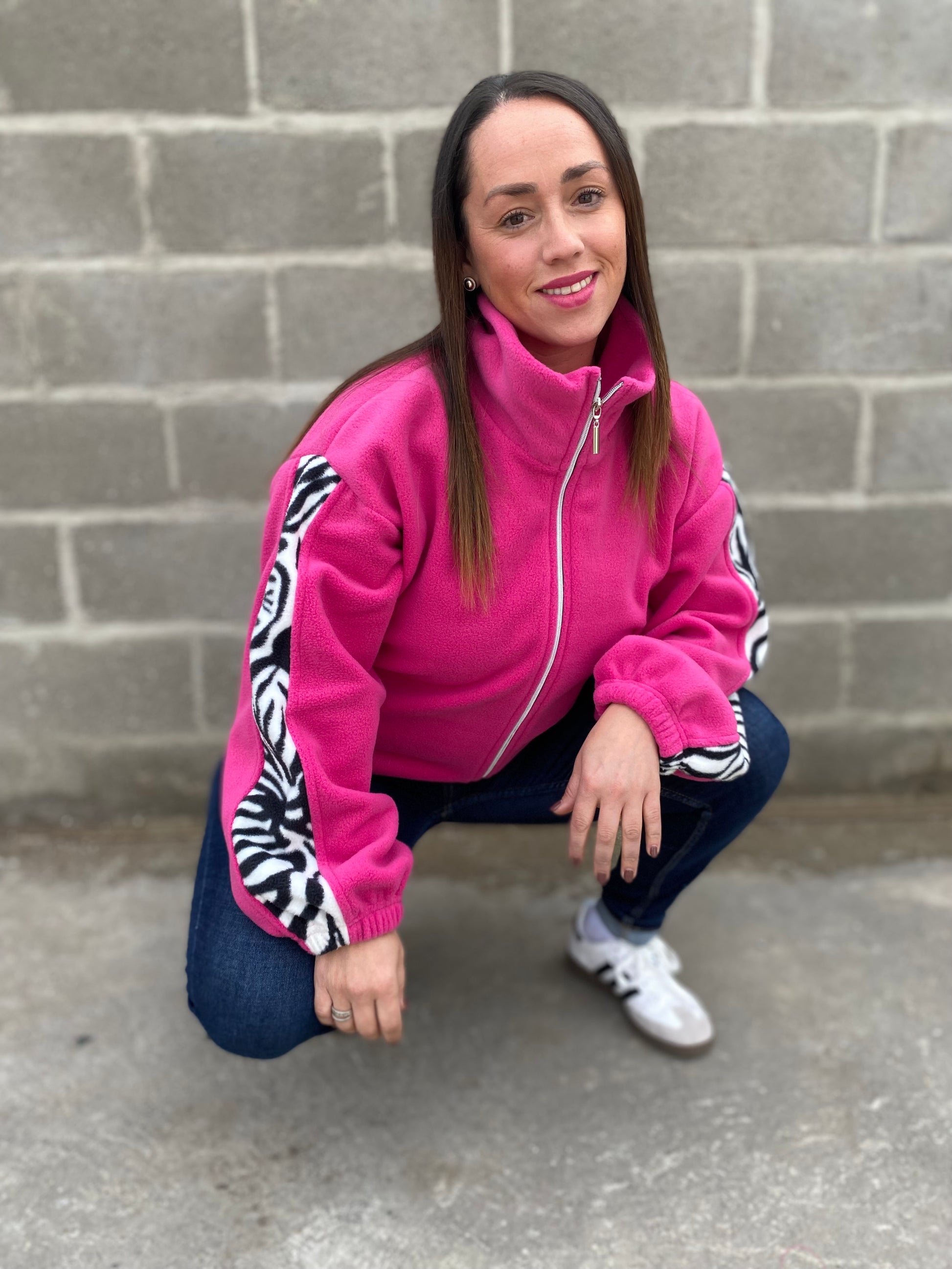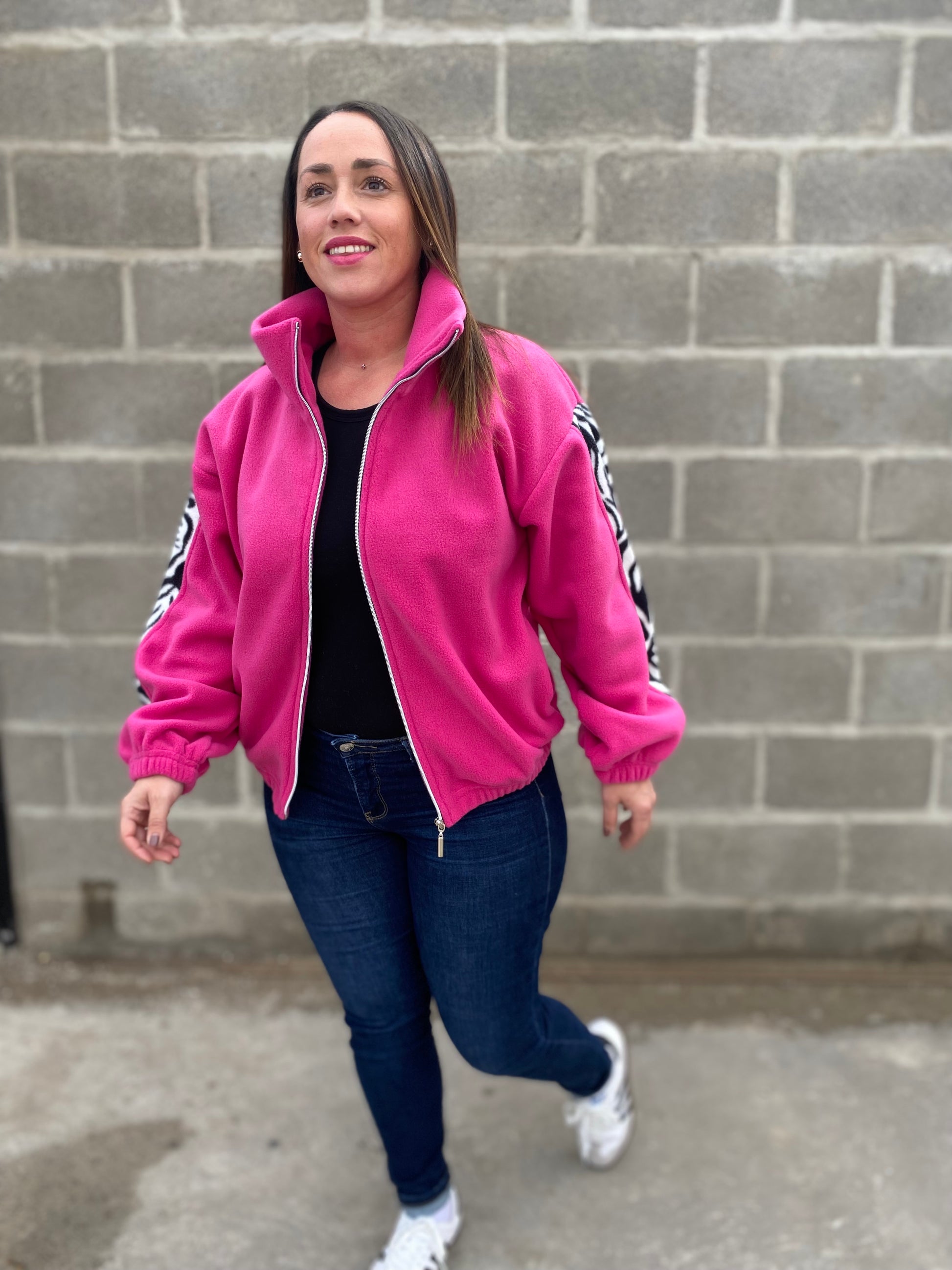 Modelo fabricado en polar con cierre completo, bolsillos y elástico en la pretina, combinación de color fucsia Barbie con franja en la manga de diseño cebra.